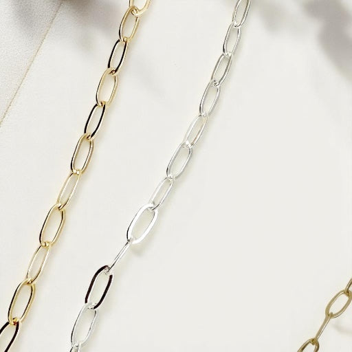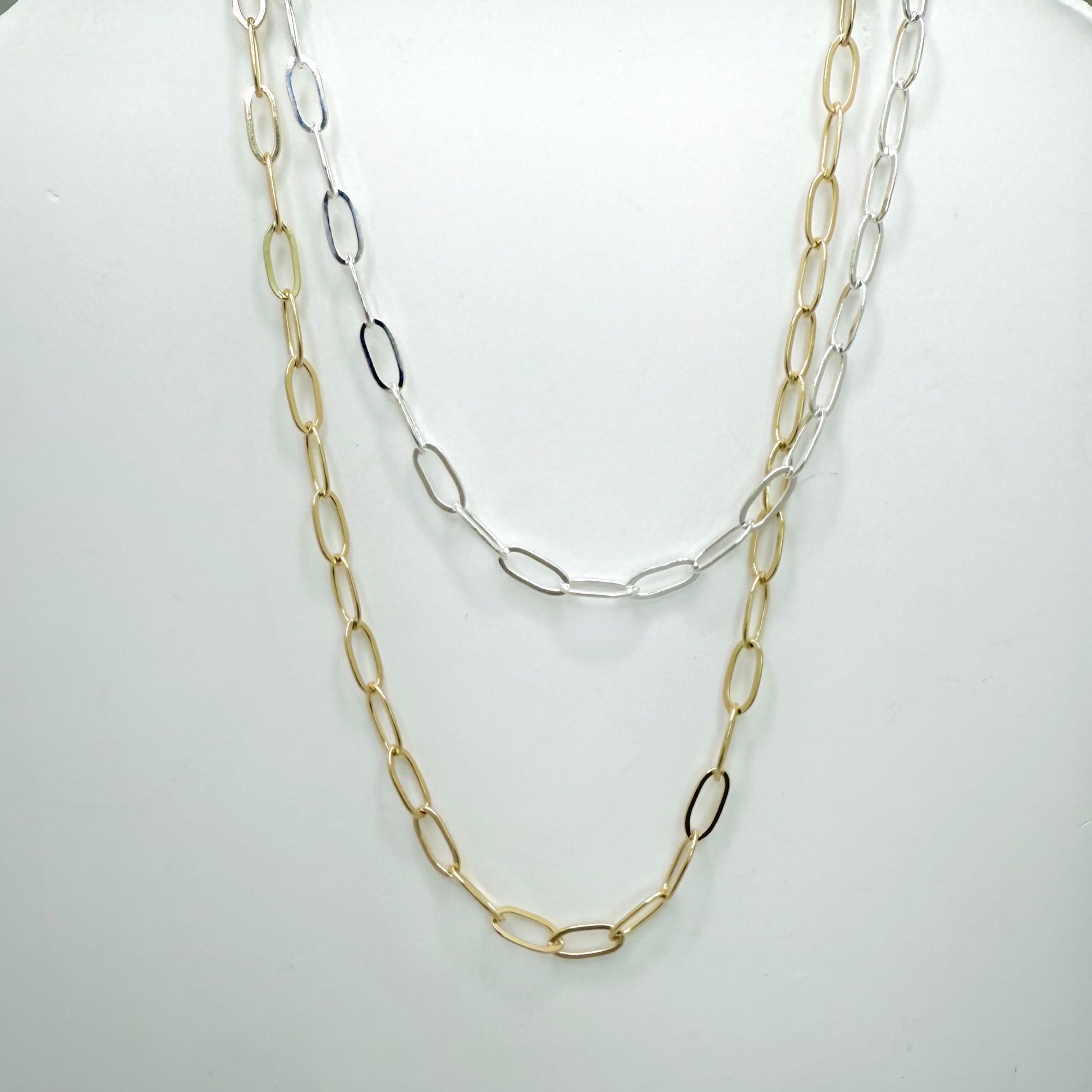 An essential! A 3.9mm wide oval link paperclip chain with enough presence to stand alone but stacks beautifully with other necklaces, too. This chain has flattened links to offer just enough extra shine. The best part?.. You can clasp it on any of the links!