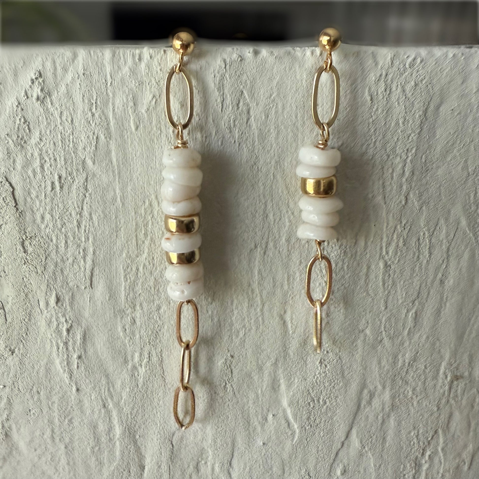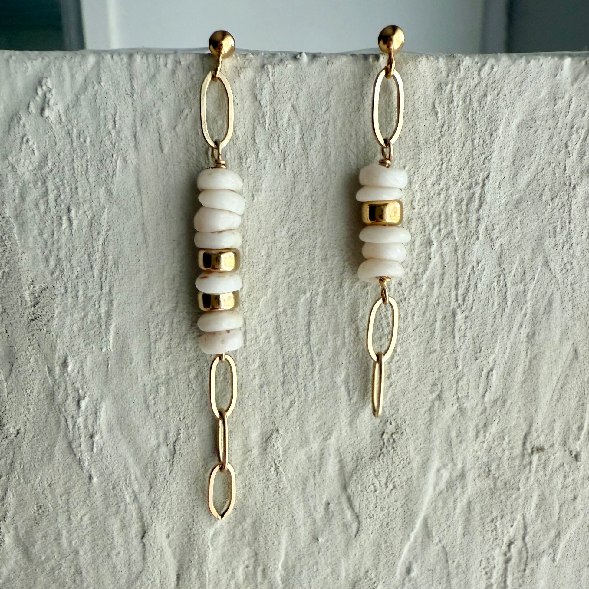 -Natural puka seashells dangling on a 3.9mm sturdy paperclip chain from a 3mm 14k gold filled or sterling silver ball post