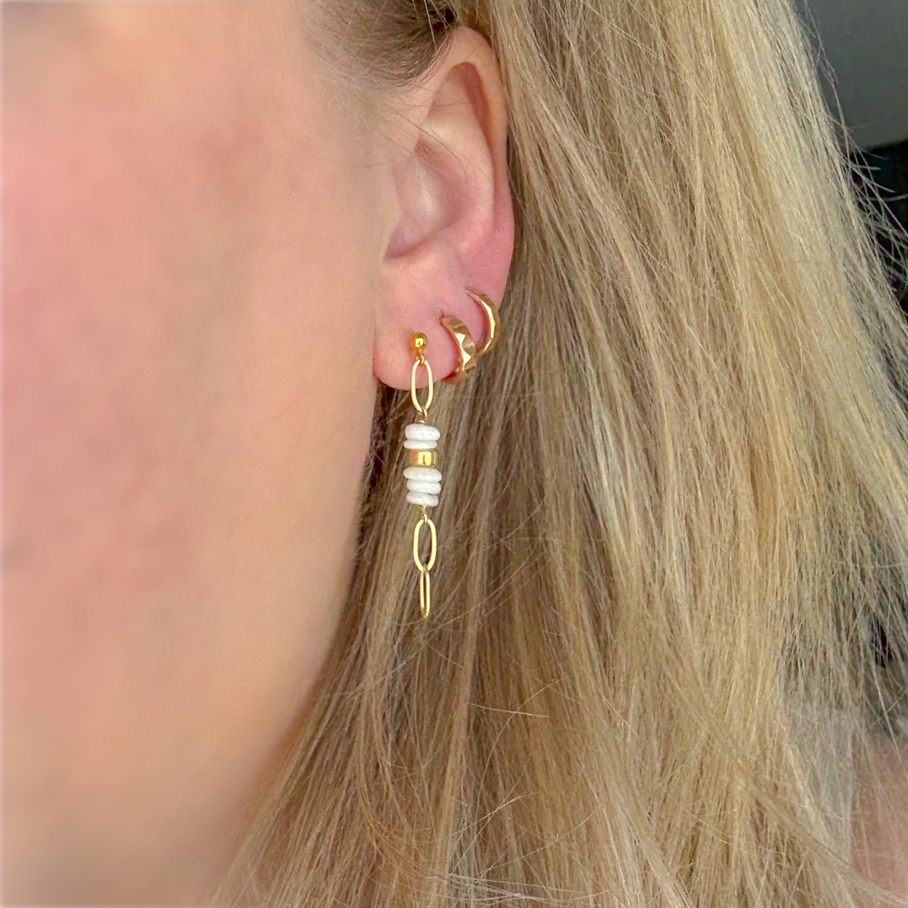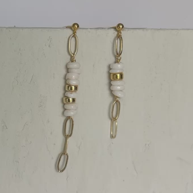 The Kai Puka Shell Dangle Studs feature natural puka shells dangling from a shiny flat paperclip chain giving them the perfect amount of shimmer. These beachy chic earrings showcase the natural beauty of our oceans while adding a touch of playful movement. For a tropical vacation, beach wedding, or everyday wear, these earrings are ready for any occasion!