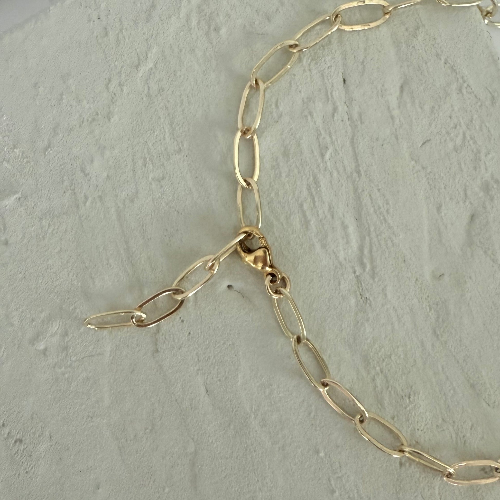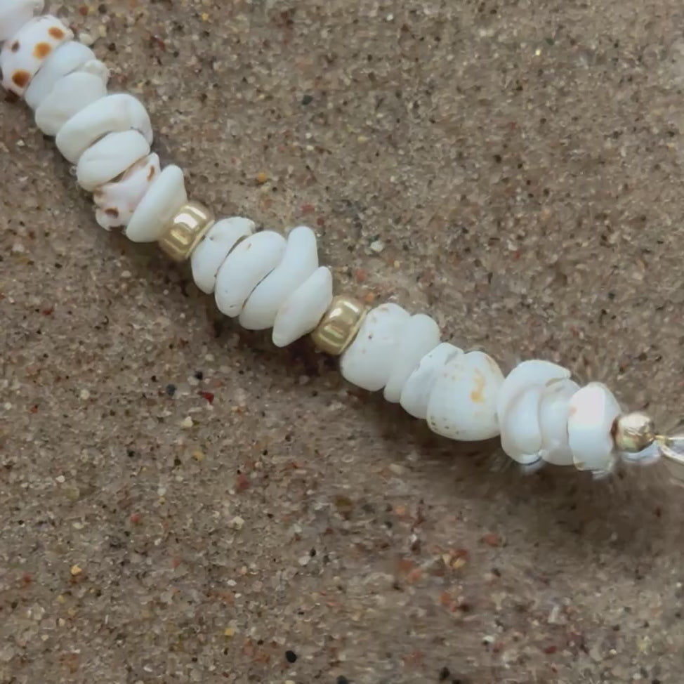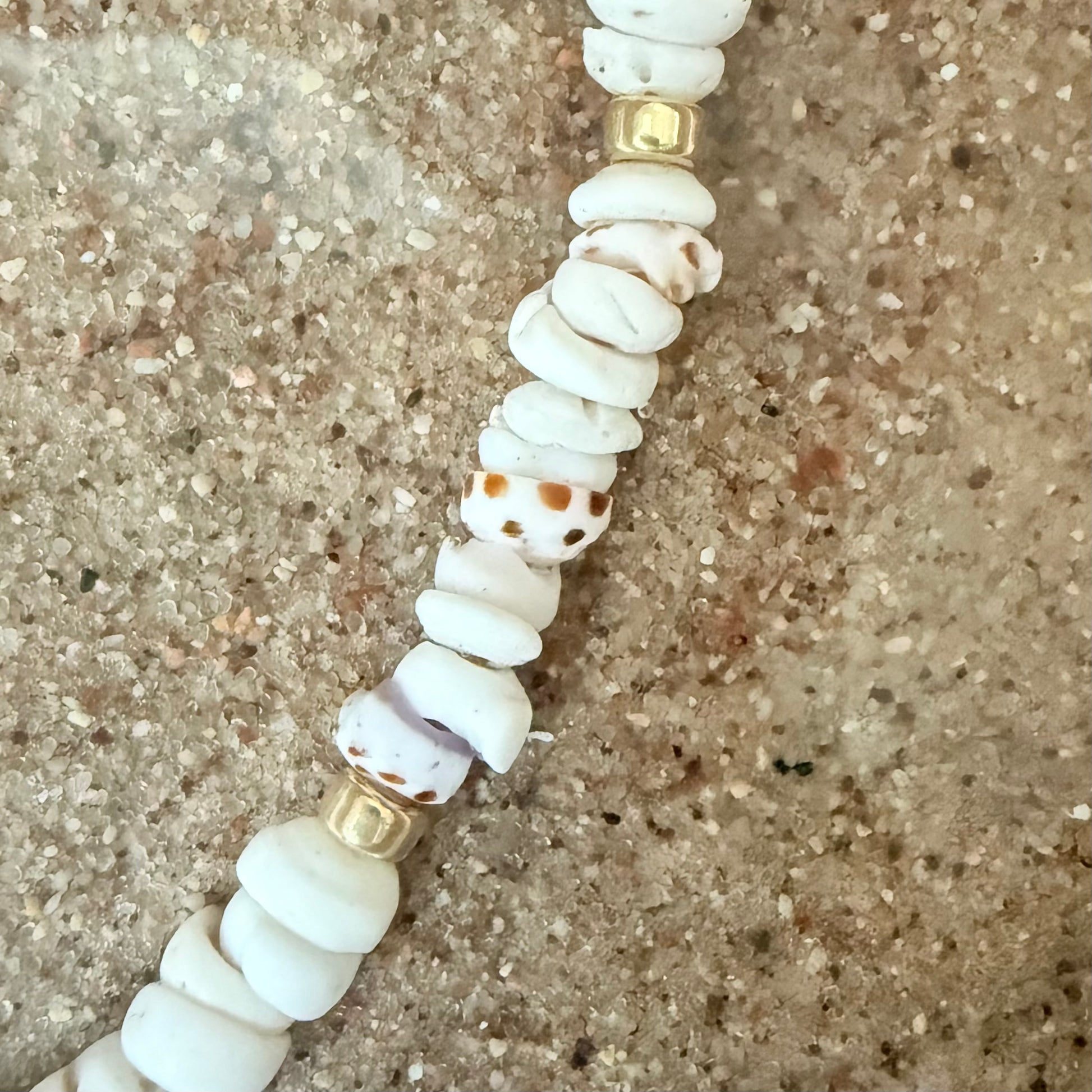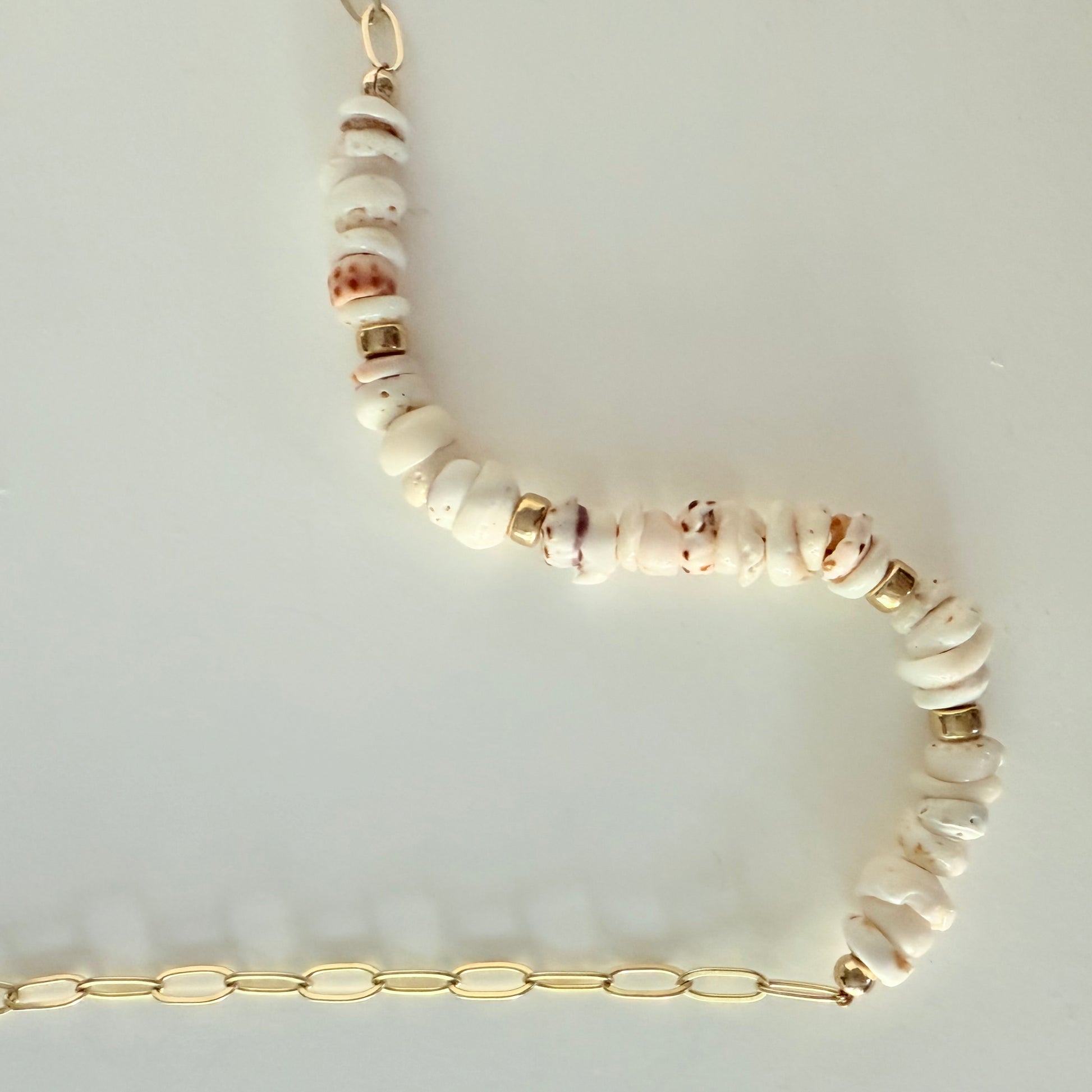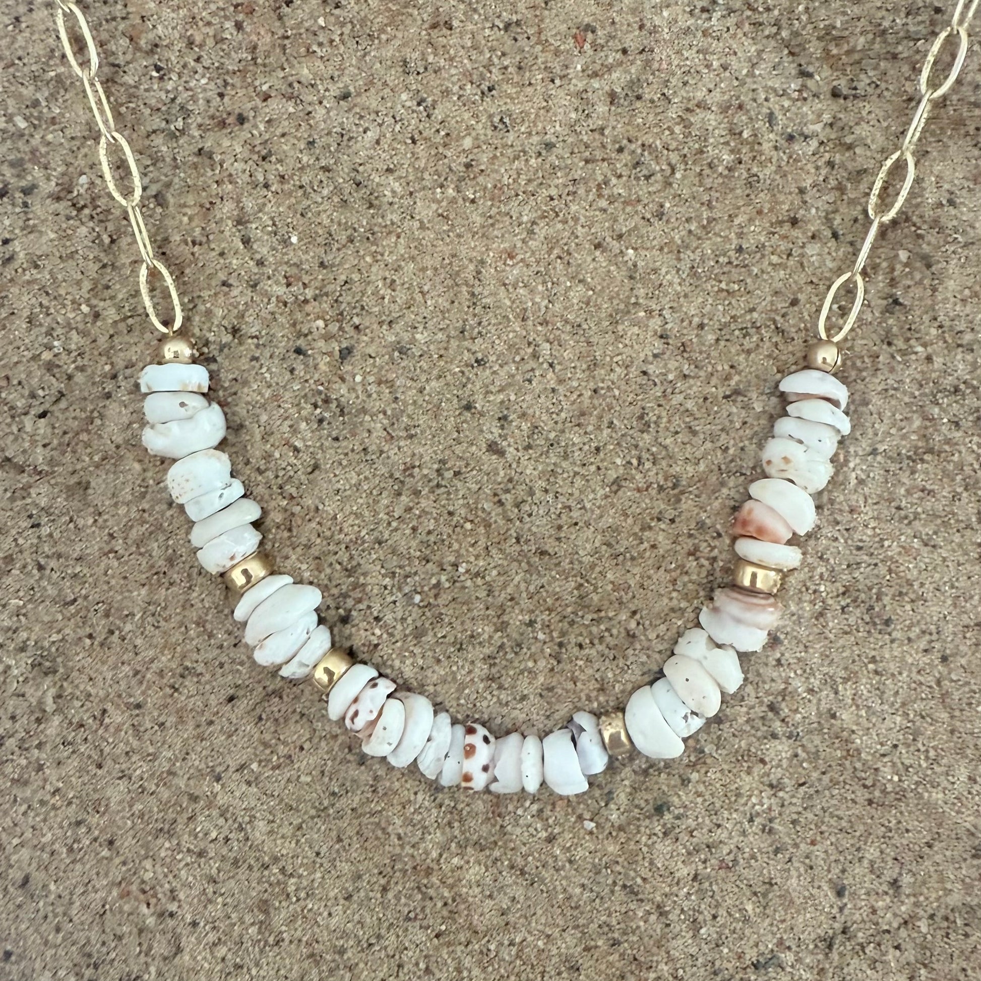 -Natural puka seashells strung on premium beading wire, attached to a sturdy 3.9mm flat paperclip chain.