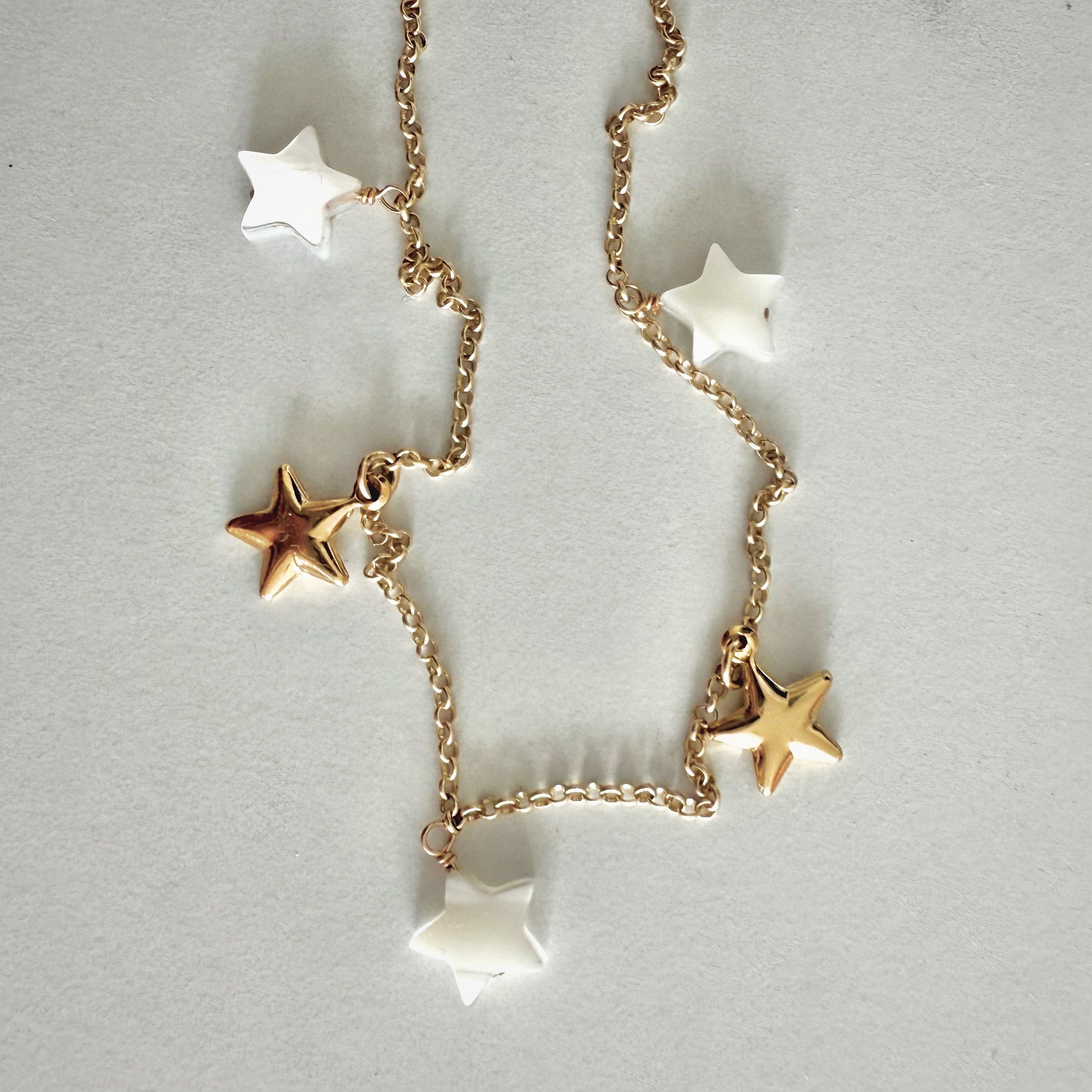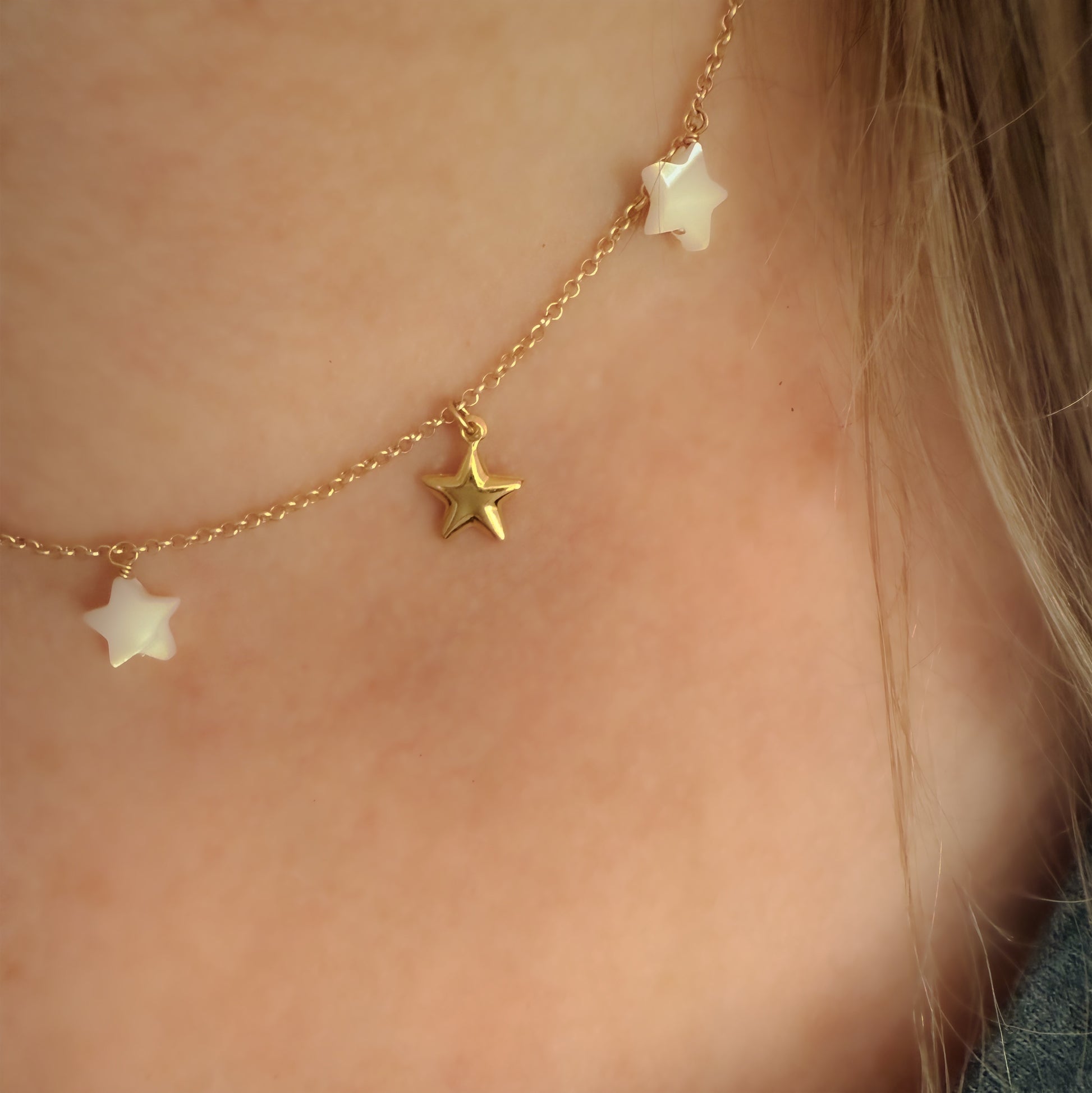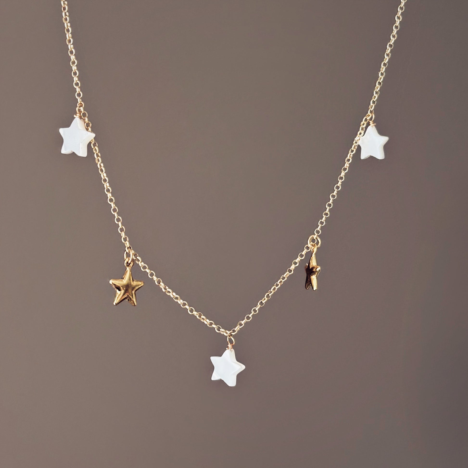 Hand crafted in 14k gold filled & sterling silver in the Pacific Northwest. The Lyra Star Charm Necklace features both Mother of Pearl star beads giving it a touch of iridescent glow & 14k gold filled or sterling silver shiny 3D puffy star charms.