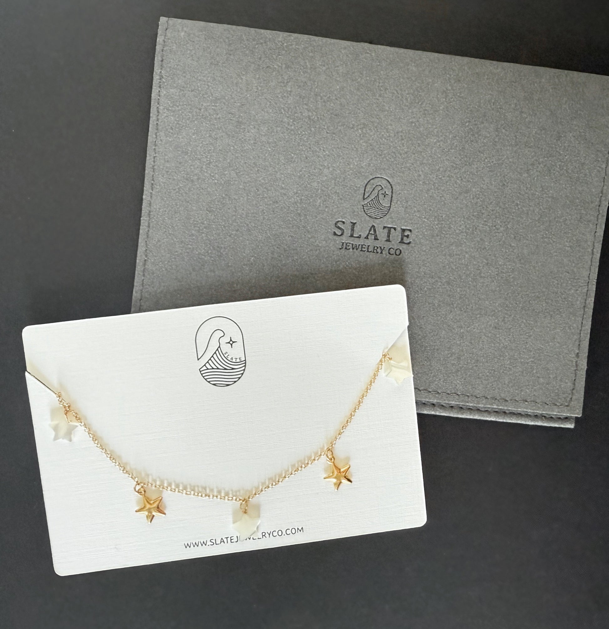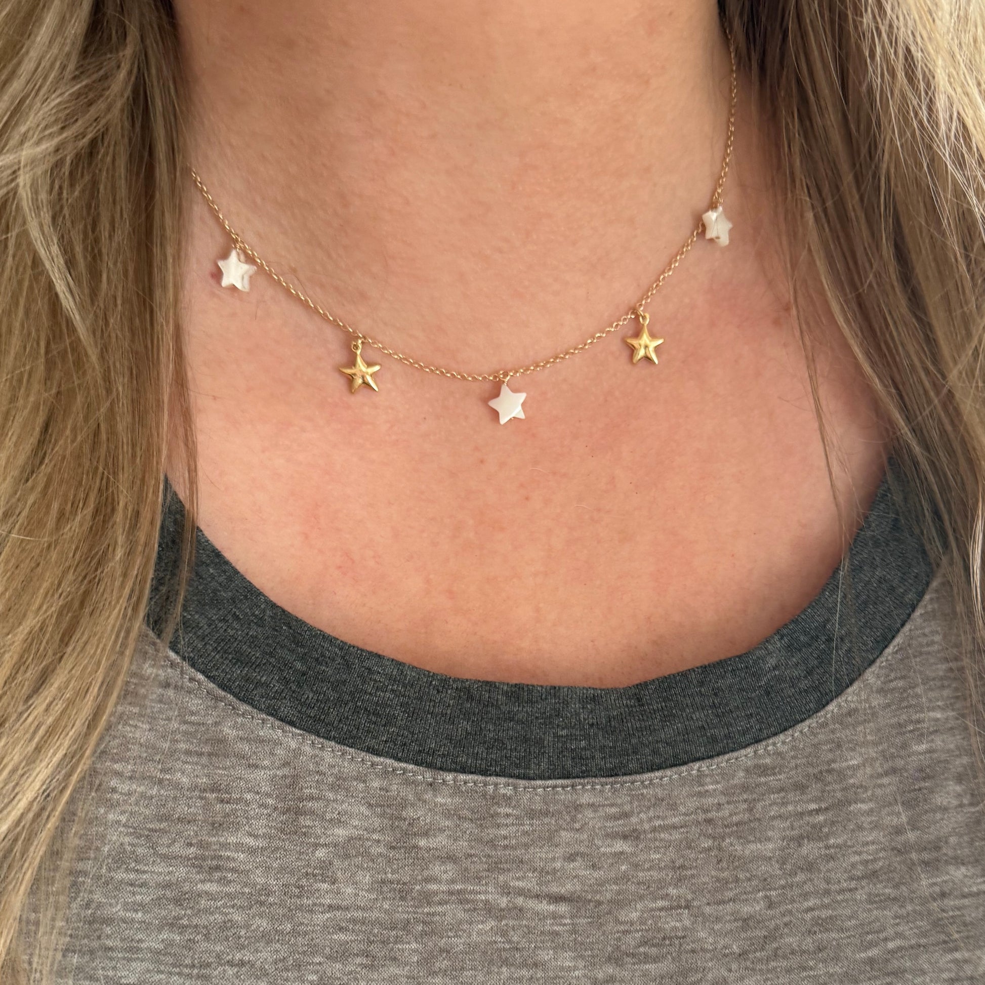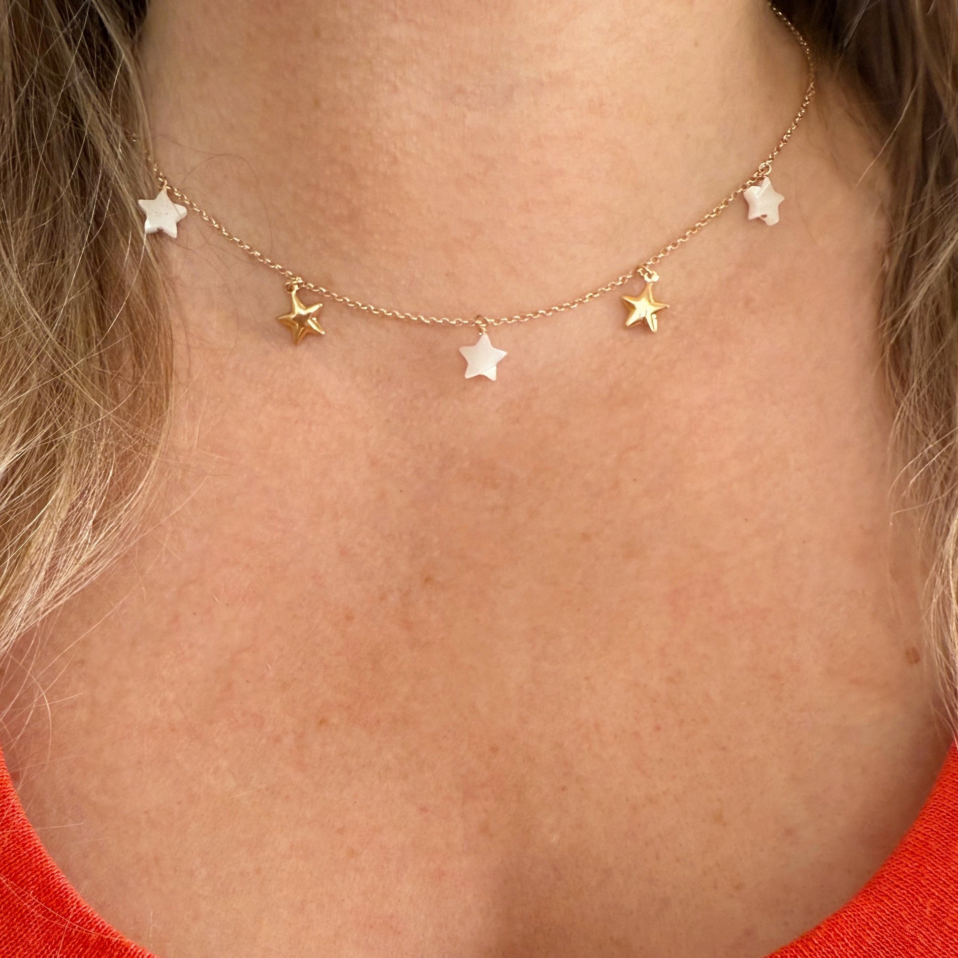 Hand crafted in 14k gold filled & sterling silver in the Pacific Northwest. The Lyra Star Charm Necklace features both Mother of Pearl star beads giving it a touch of iridescent glow & 14k gold filled or sterling silver shiny 3D puffy star charms.