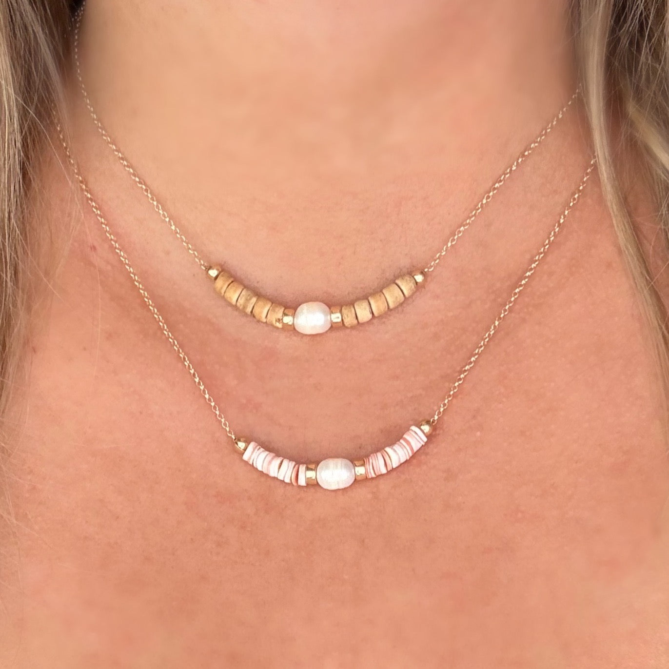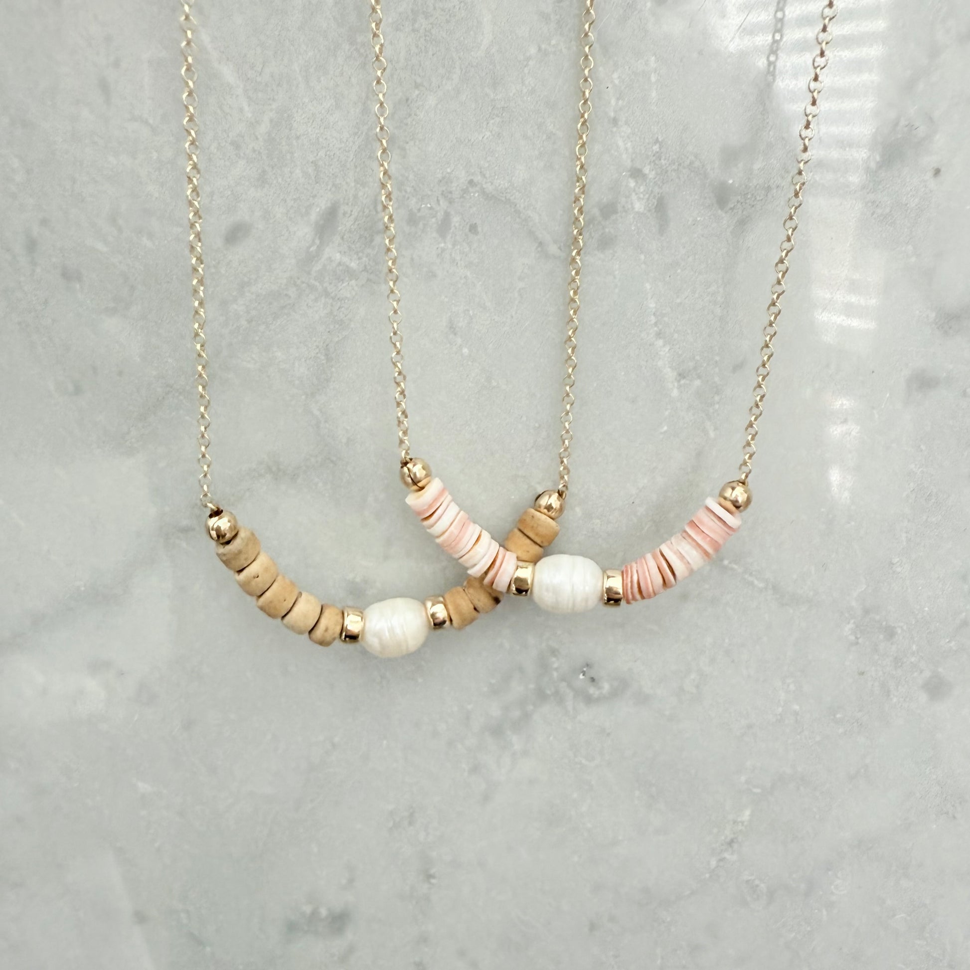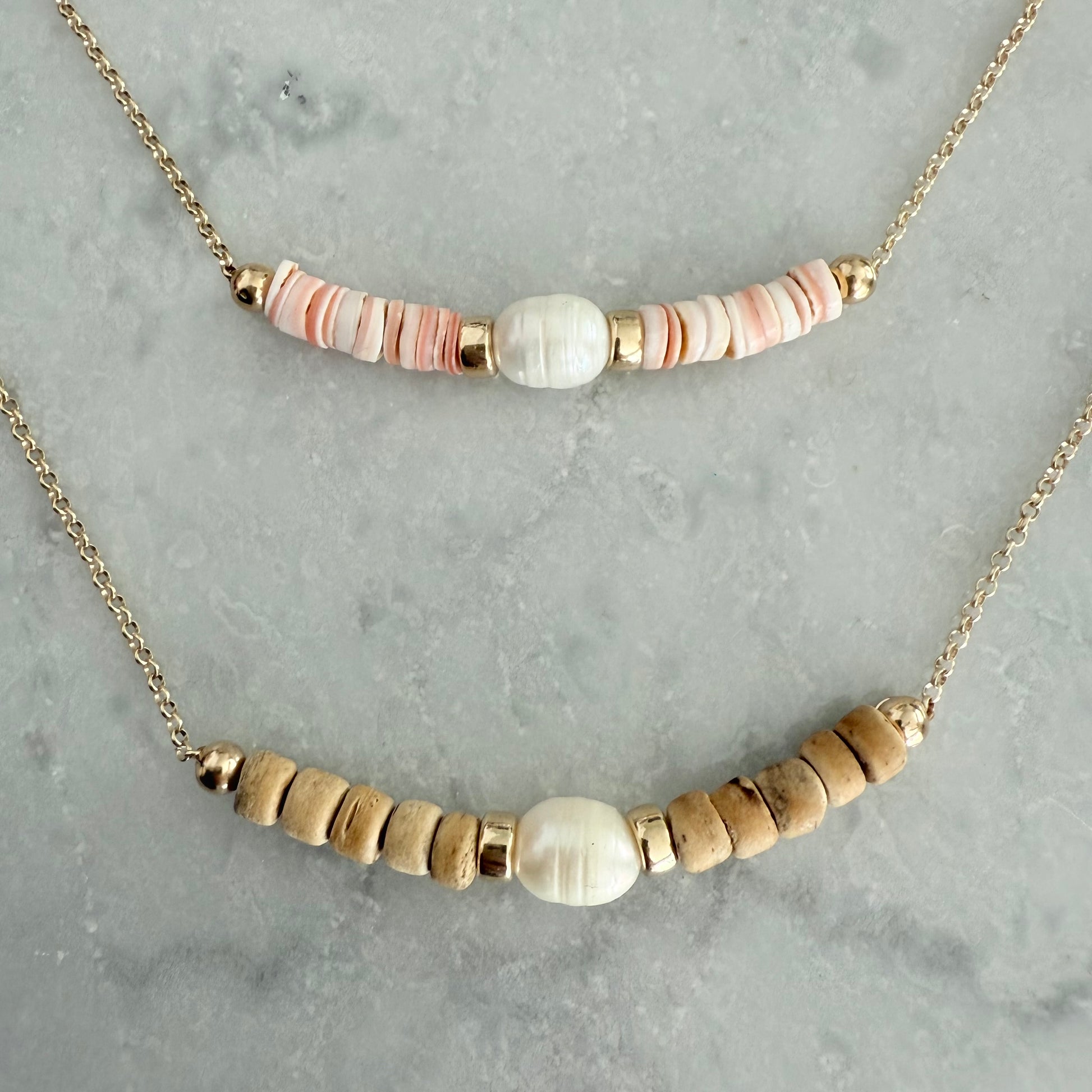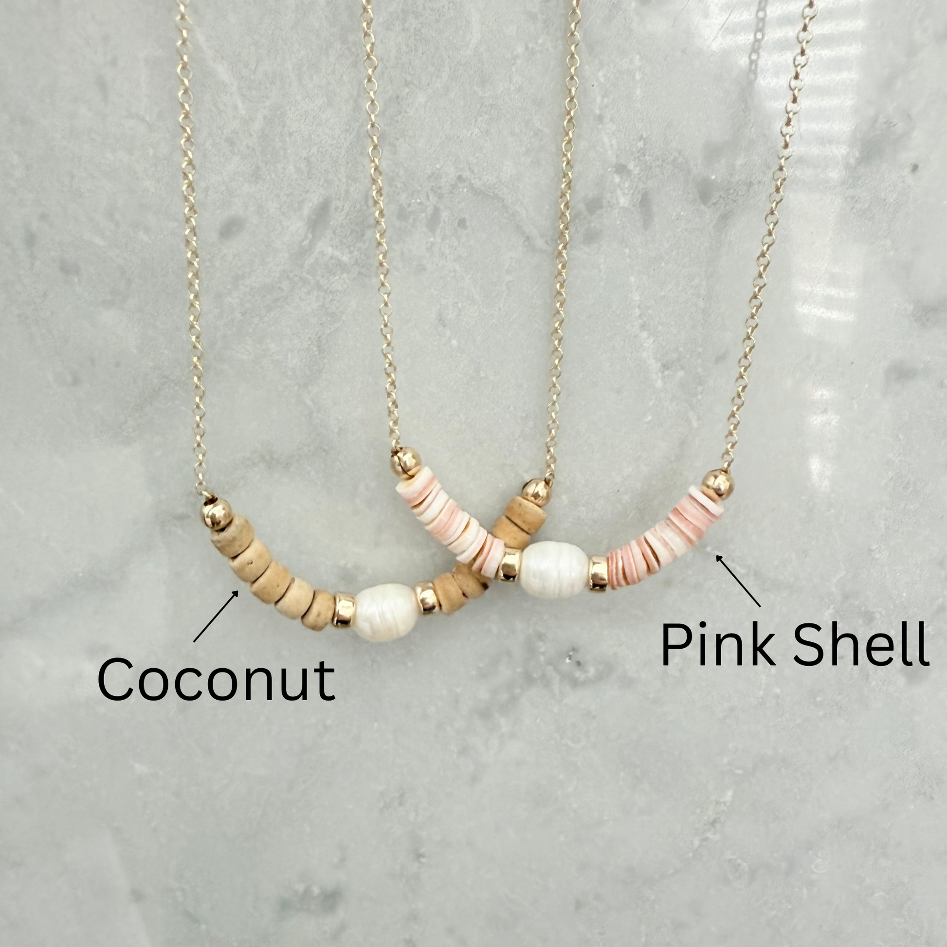 The Maya Necklace comes in your choice of pink / peach seashells or natural coconut beads, both styles adorn a freshwater pearl in the center. Ready for a tropical vacation, beach wedding, or everyday wear, this beachy beauty will become a summer time favorite! She can be worn alone or stacks so beautifully with your other favorite necklaces.