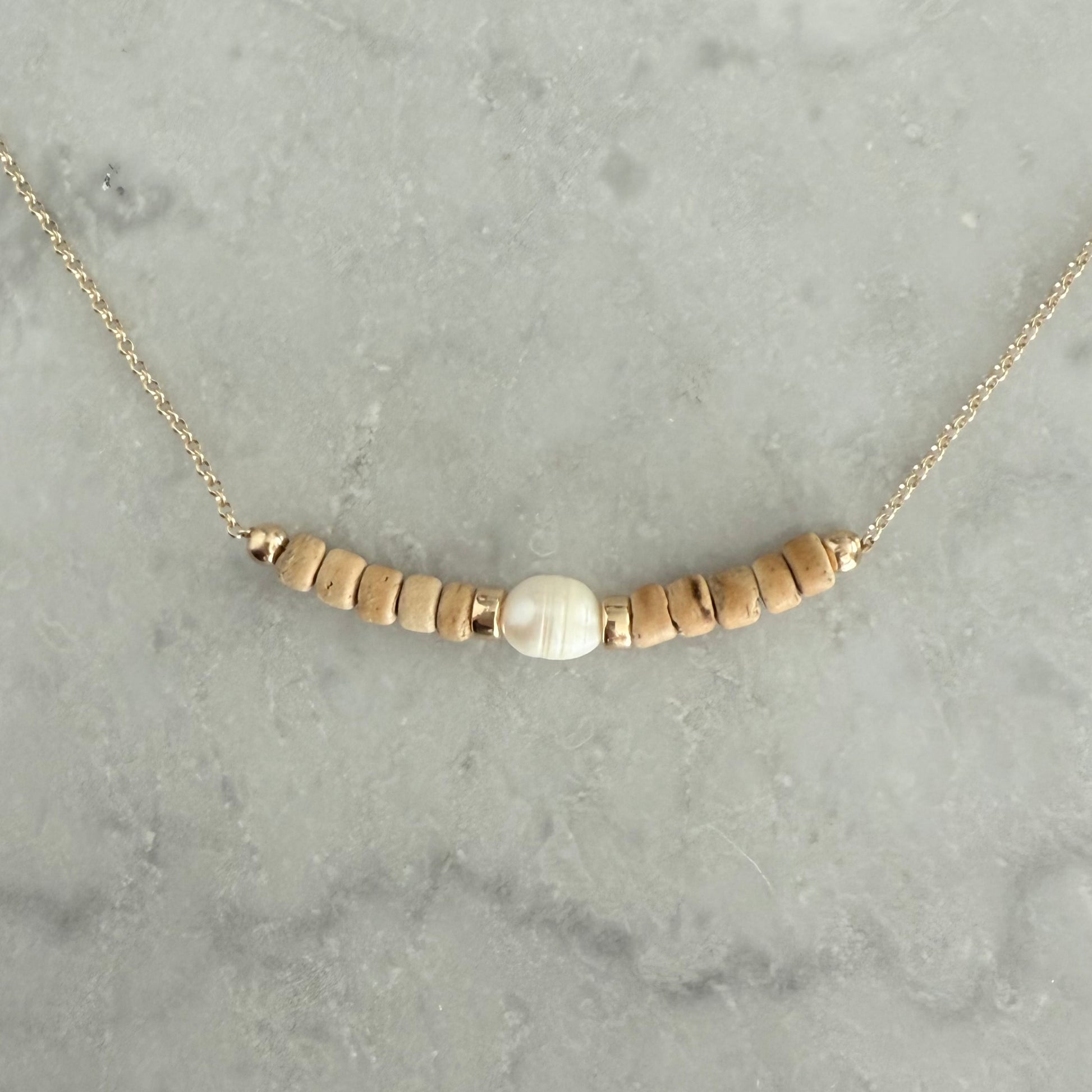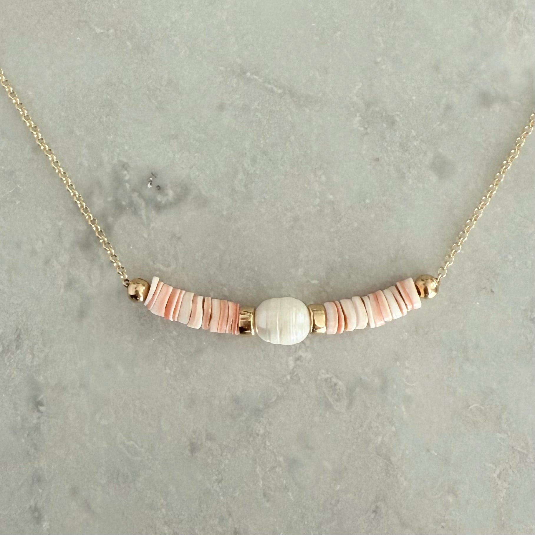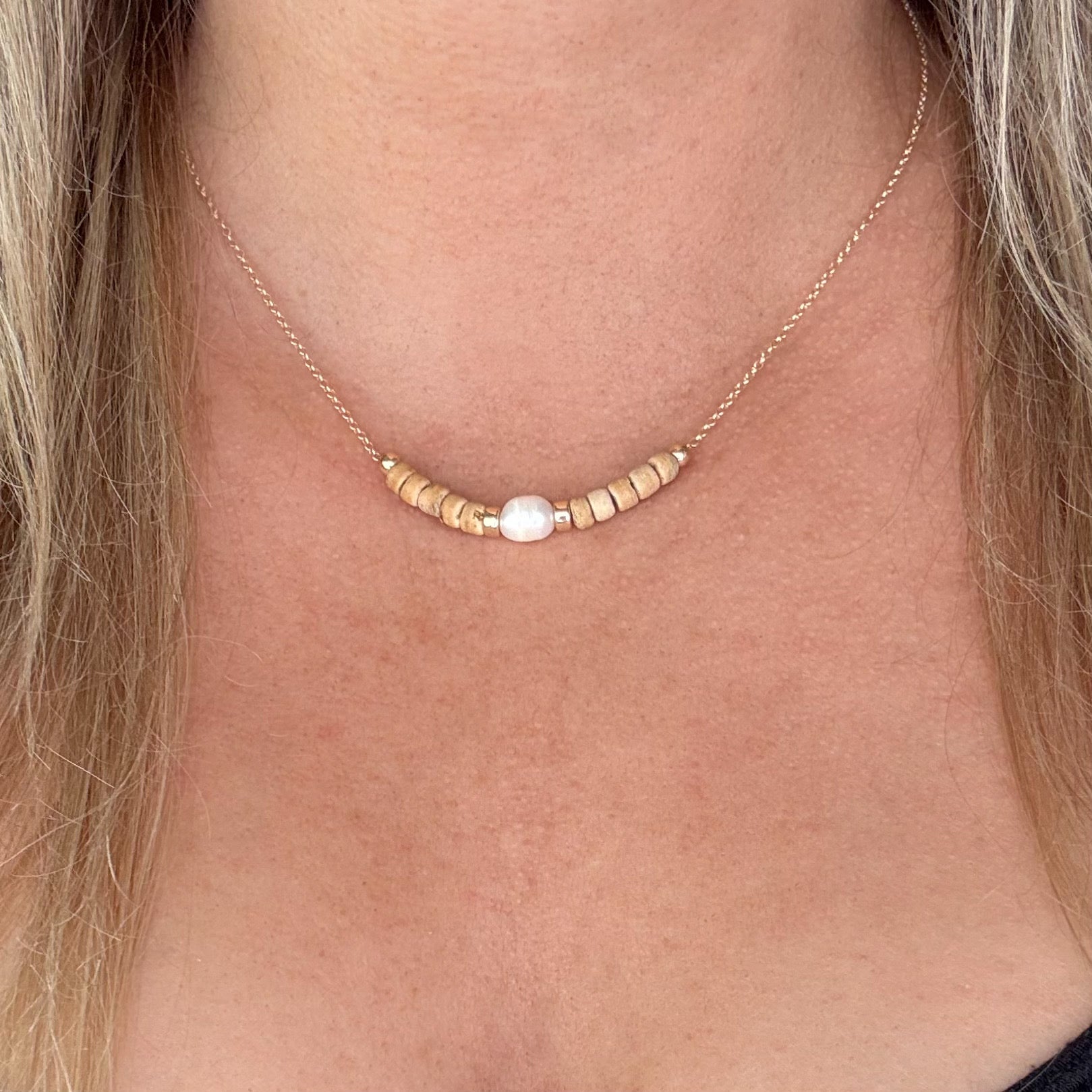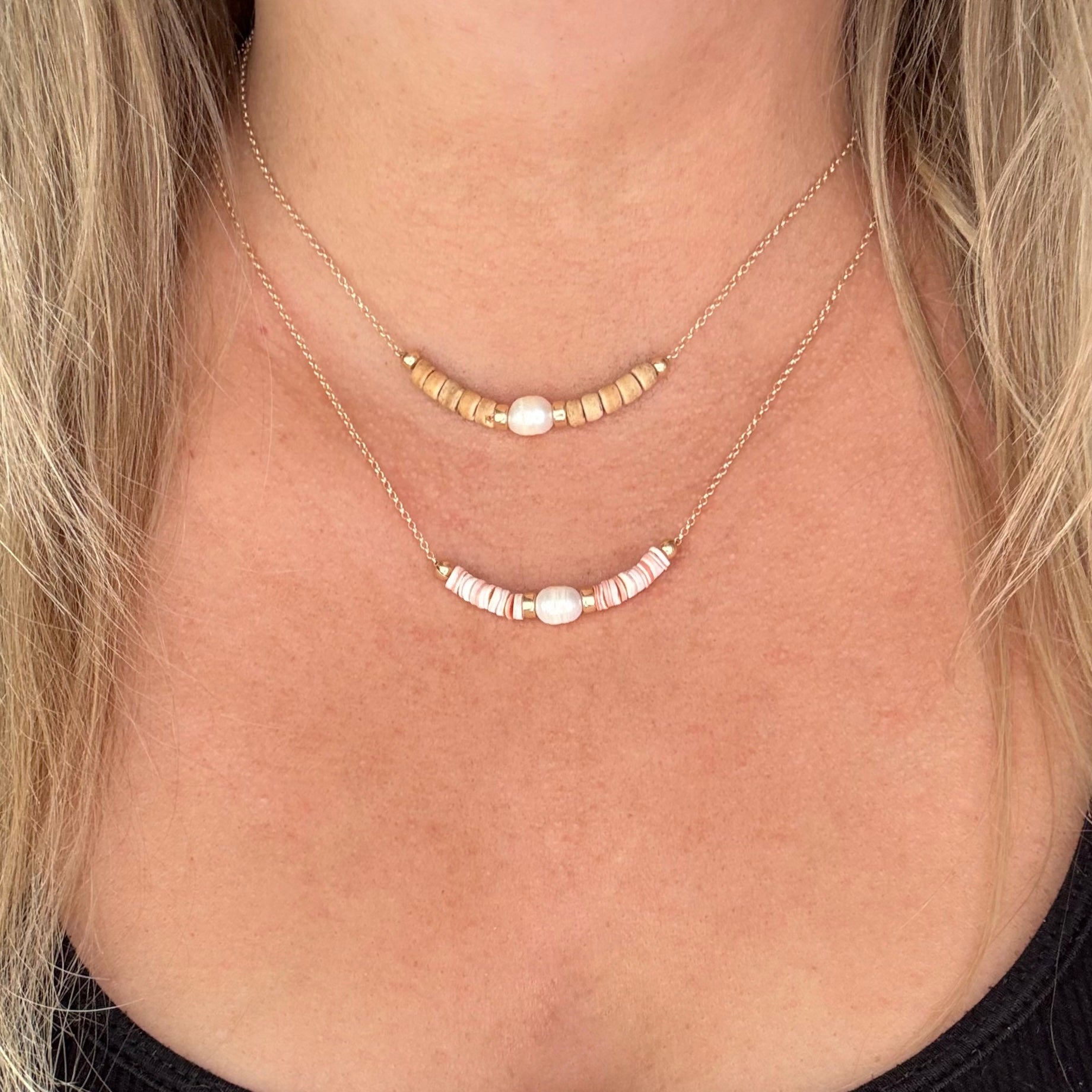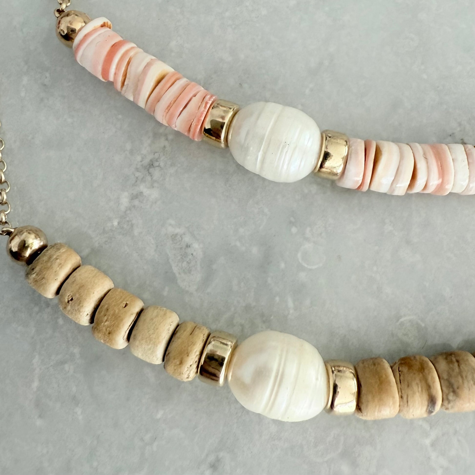 The Maya Necklace comes in your choice of pink / peach seashells or natural coconut beads, both styles adorn a freshwater pearl in the center. Ready for a tropical vacation, beach wedding, or everyday wear, this beachy beauty will become a summer time favorite! She can be worn alone or stacks so beautifully with your other favorite necklaces.