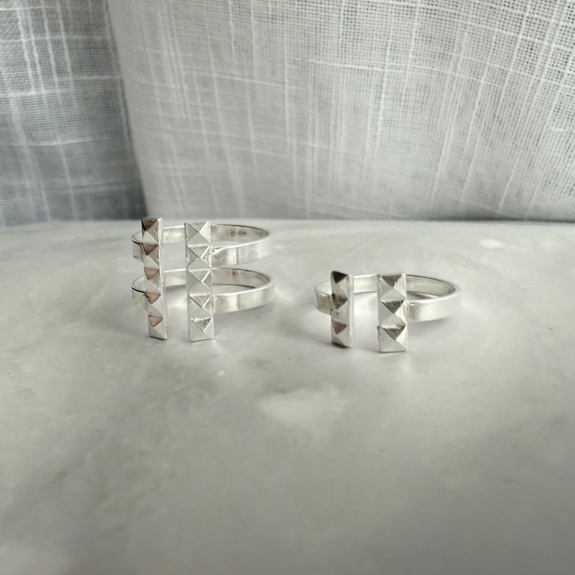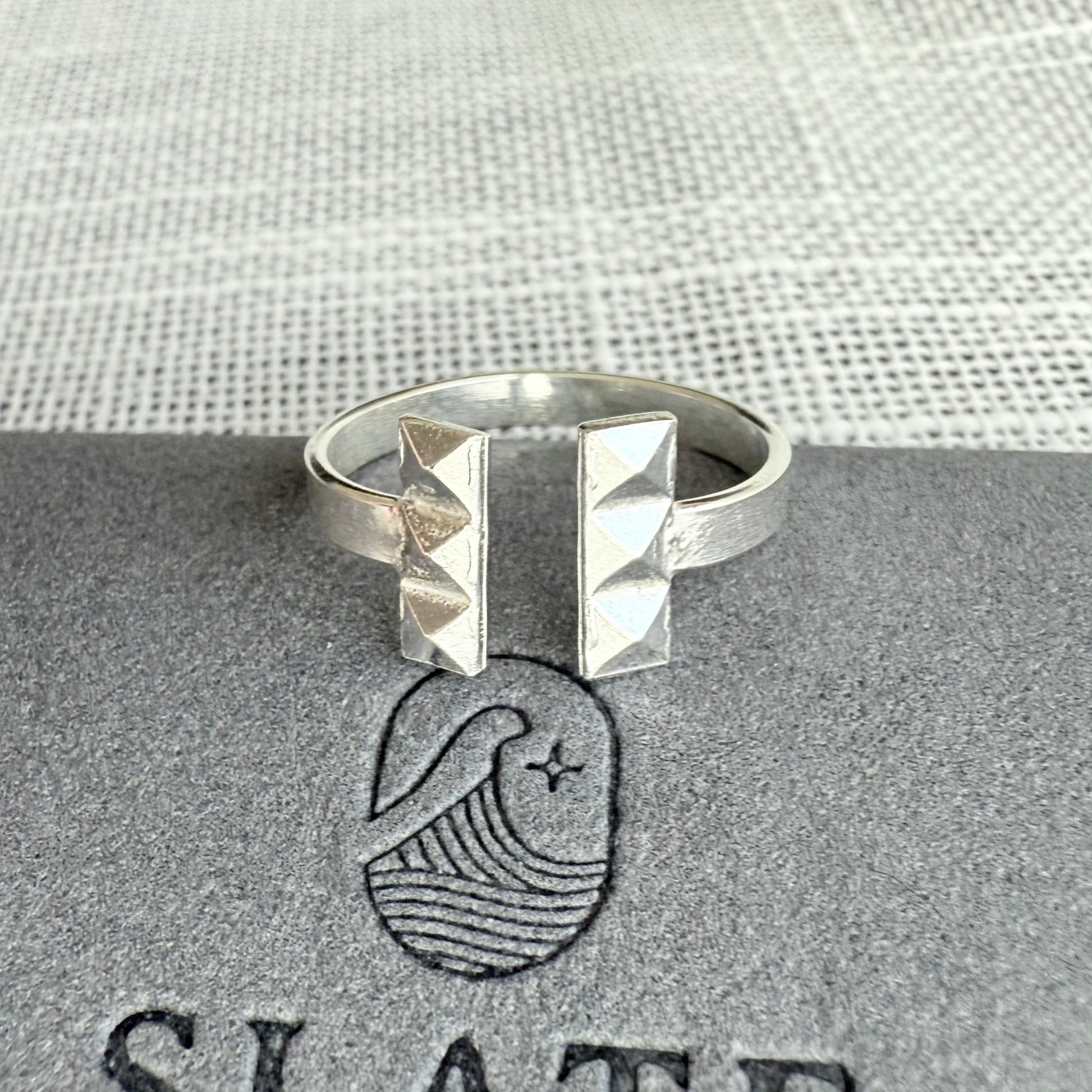 An edgier take on a classic T bar ring. The triple pyramid bars really set this ring apart and add a modern stylish touch.