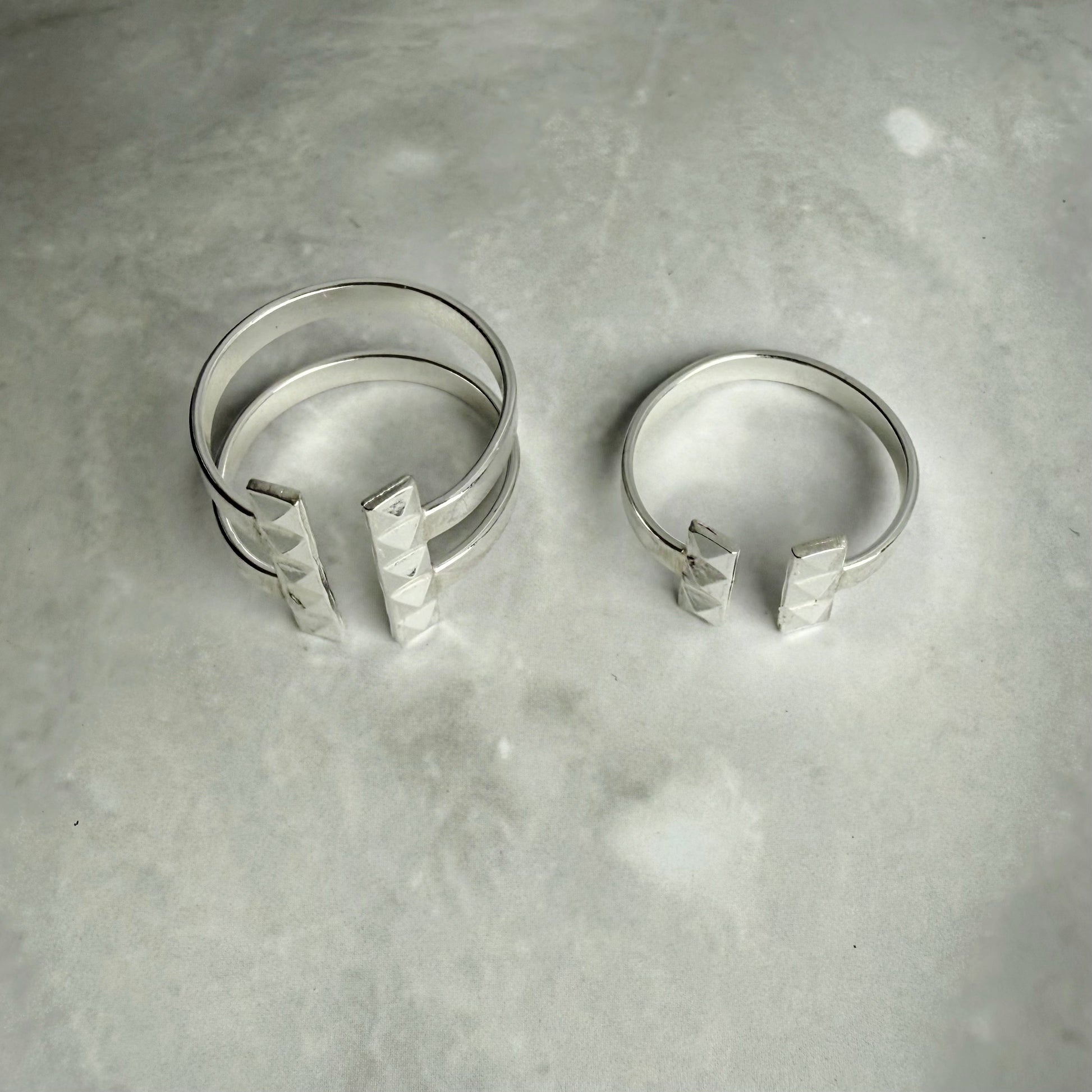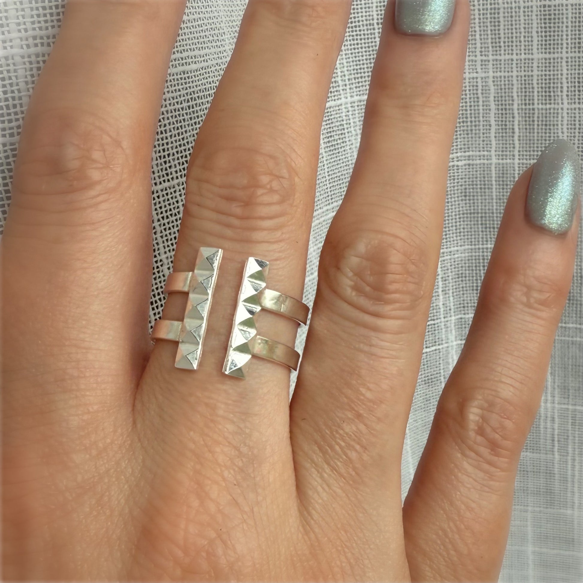 A bolder take on a classic T bar ring. The 5 pyramid bars really set this ring apart and add an edgy side to this statement ring. This sturdy ring holds up well to daily wear.