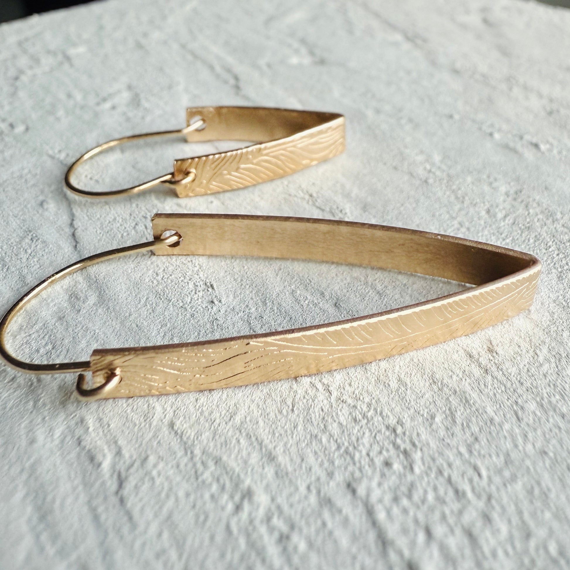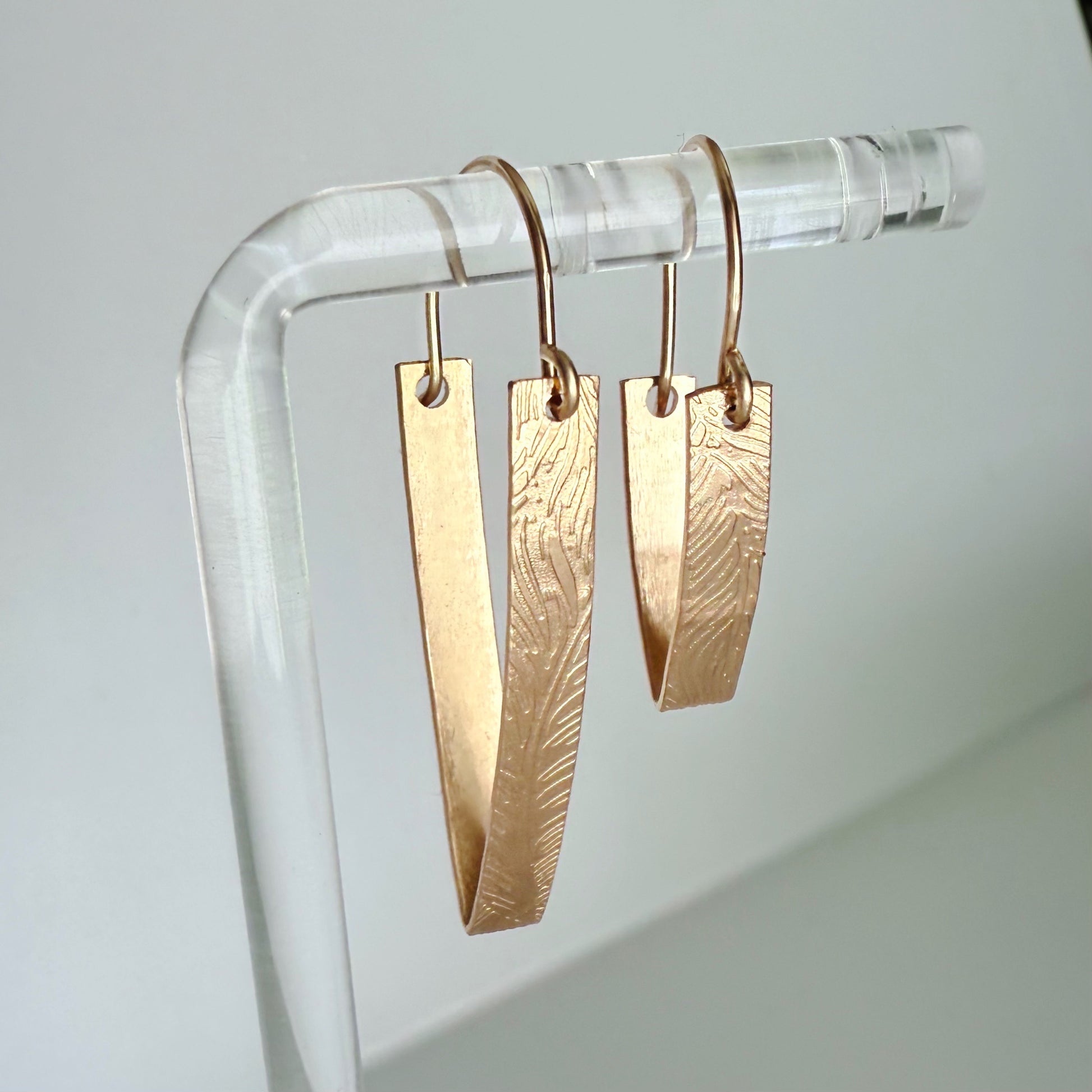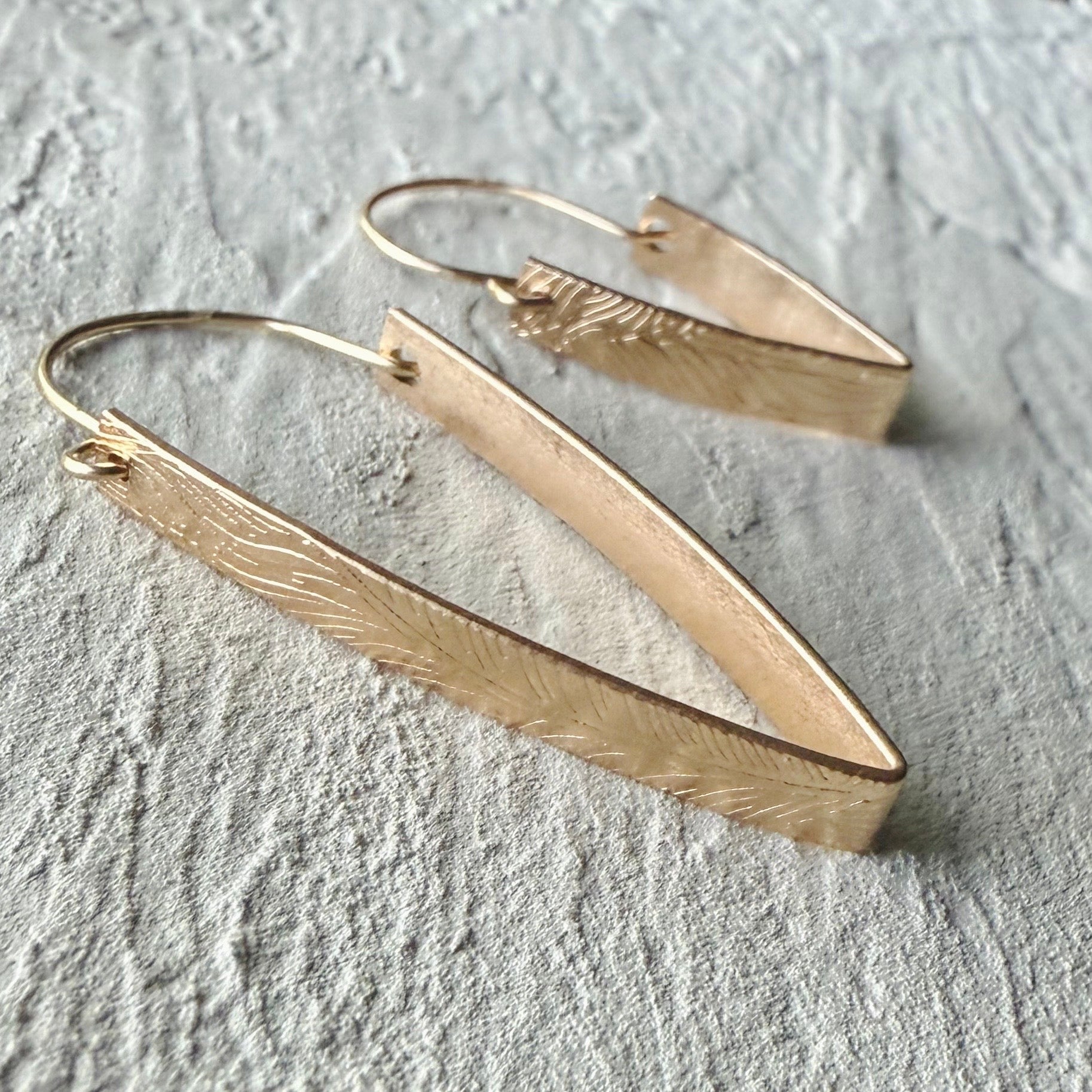 Hand crafted in solid 925 sterling silver & USA manufactured 14k gold filled materials in the Pacific Northwest. The Plume Peacock Feather V earrings feature a beautiful embossed feather pattern on a triangle shaped hoop. A classic style hoop set apart by its texture and shape, this is an earring you need in your collection!