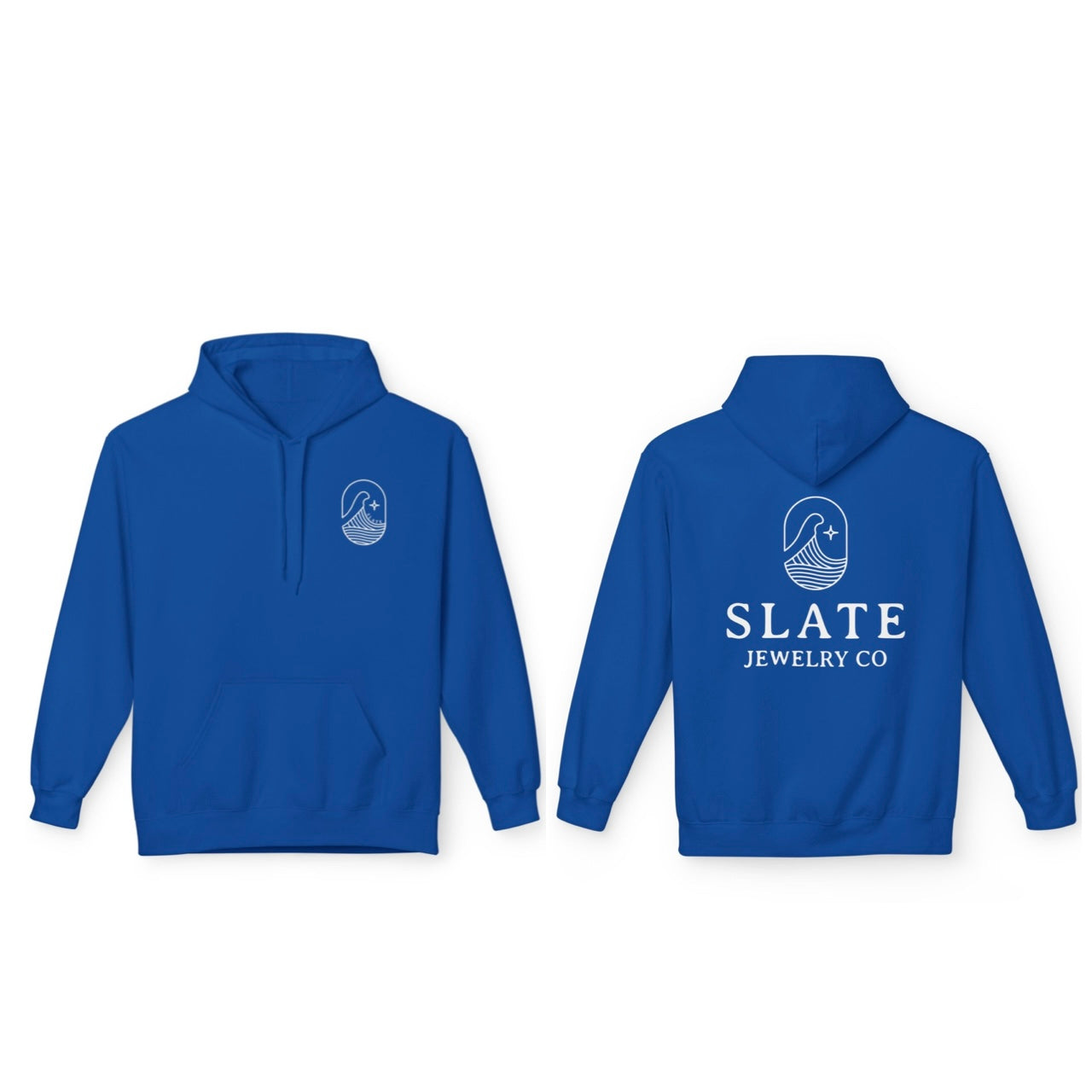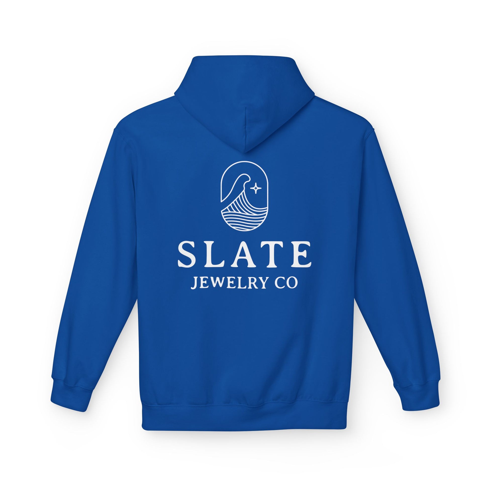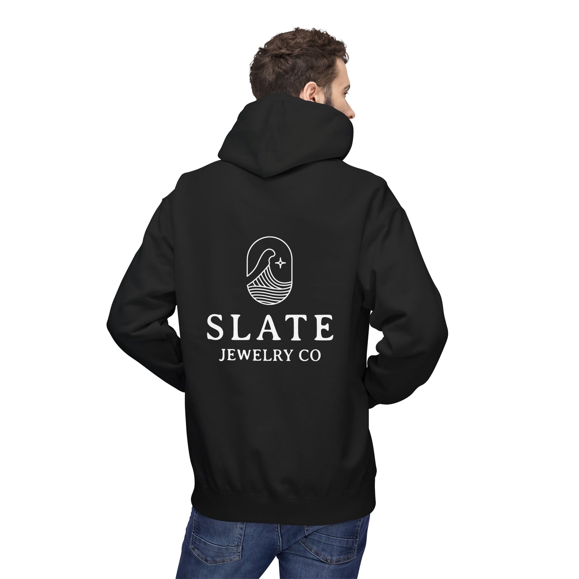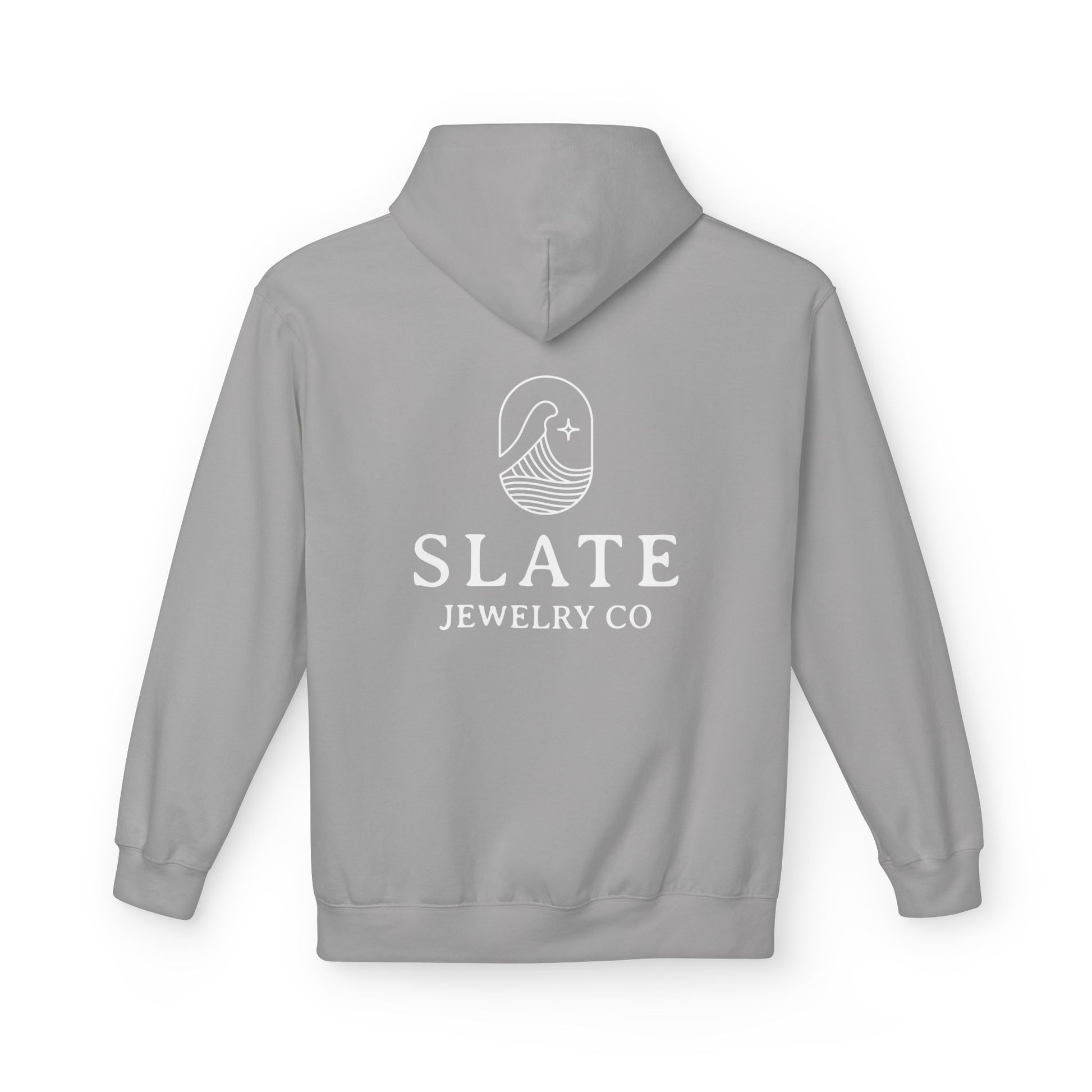 A soft midweight hoodie featuring a small Slate Jewelry Co icon on the front with a full logo on back.