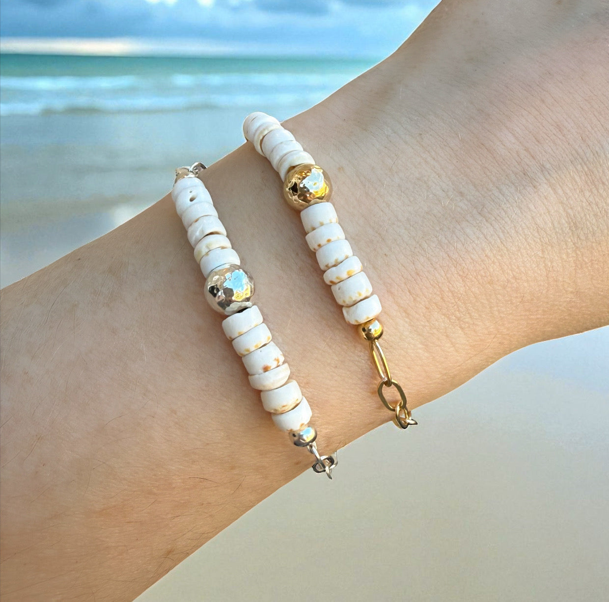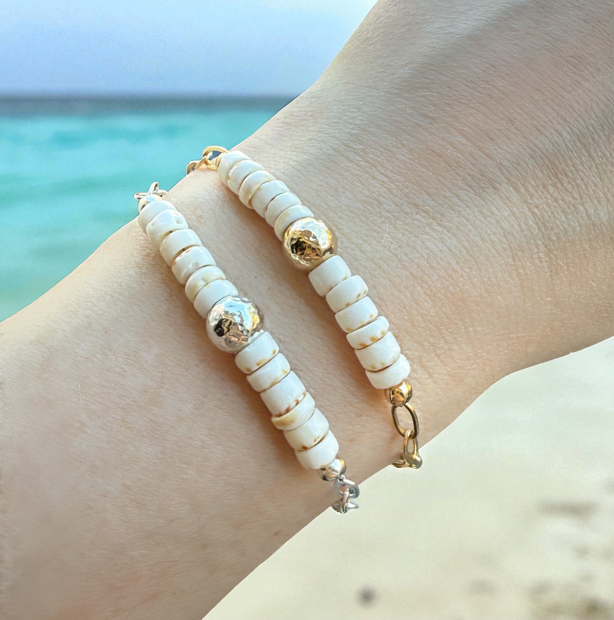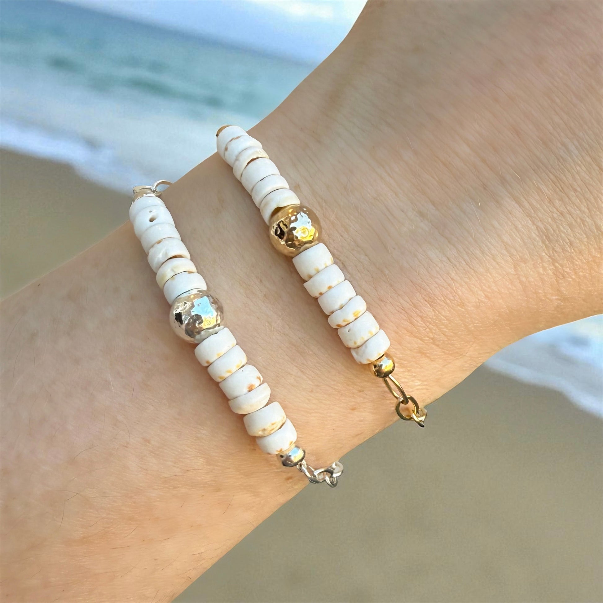Kick around the sandy shores or wear as a memory of your fav beach or vacation, the Lani Puka Shell Bracelet features authentic natural puka shells with a centered hammered accent bead attached to a shiny flat paperclip chain giving it the perfect amount of shimmer. For a tropical vacay, beach wedding, or everyday wear, this beach beauty will become a summer favorite!