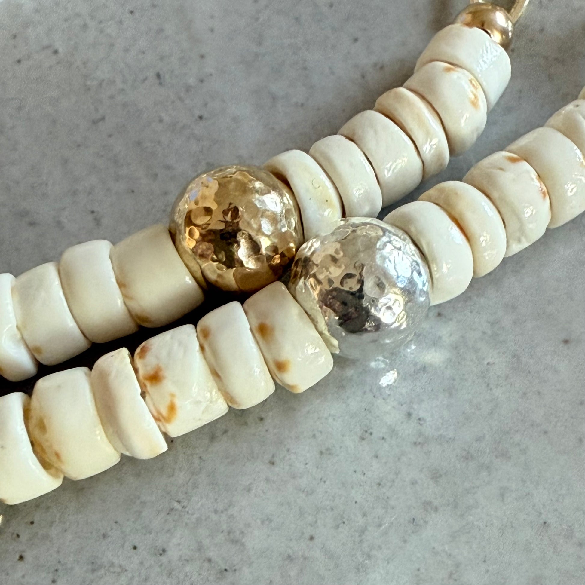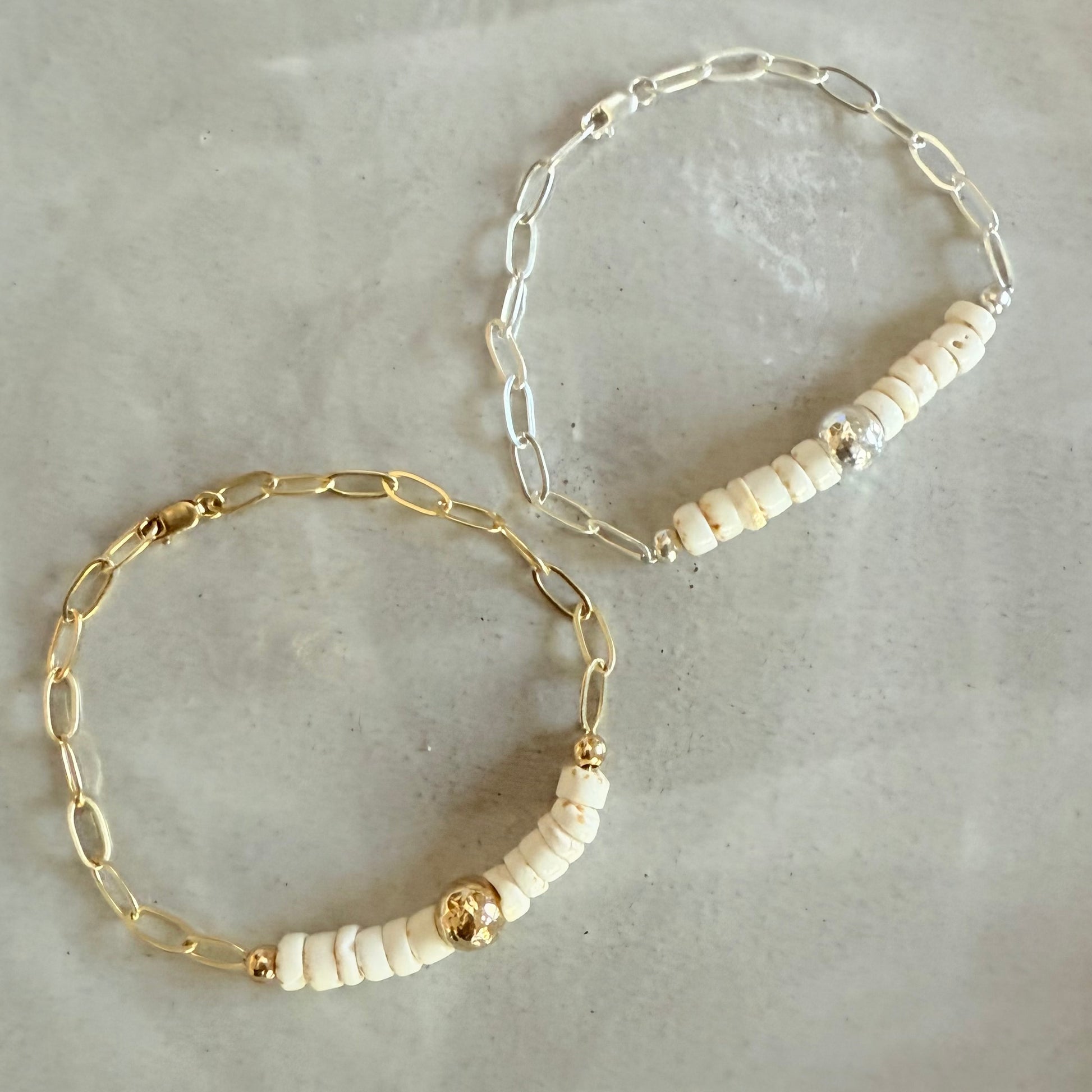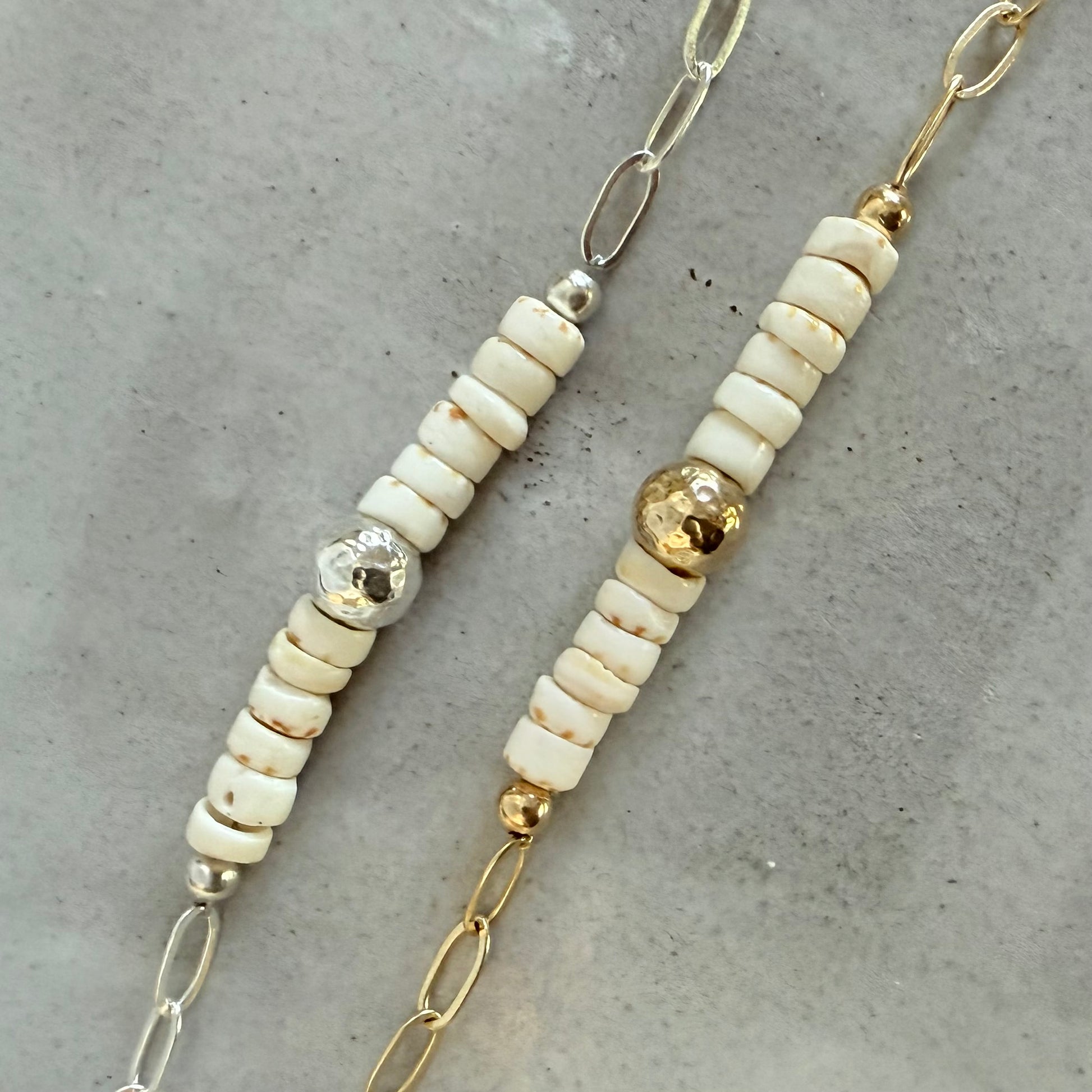 Kick around the sandy shores or wear as a memory of your fav beach or vacation, the Lani Puka Shell Bracelet features authentic natural puka shells with a centered hammered accent bead attached to a shiny flat paperclip chain giving it the perfect amount of shimmer. For a tropical vacay, beach wedding, or everyday wear, this beach beauty will become a summer favorite!